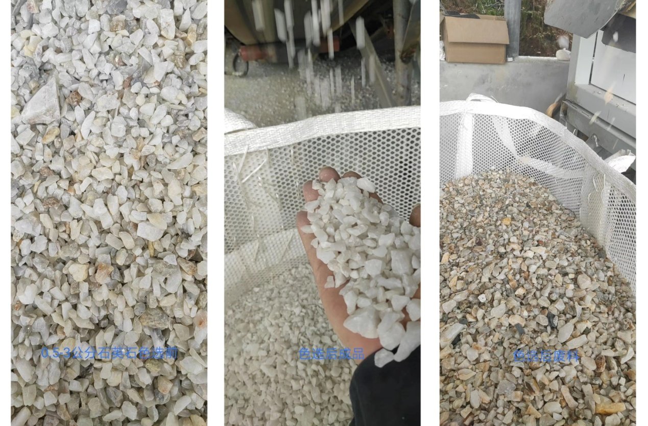 0.5~3公分石英石色選前(左);色選后成品(中)色選后廢品(右)