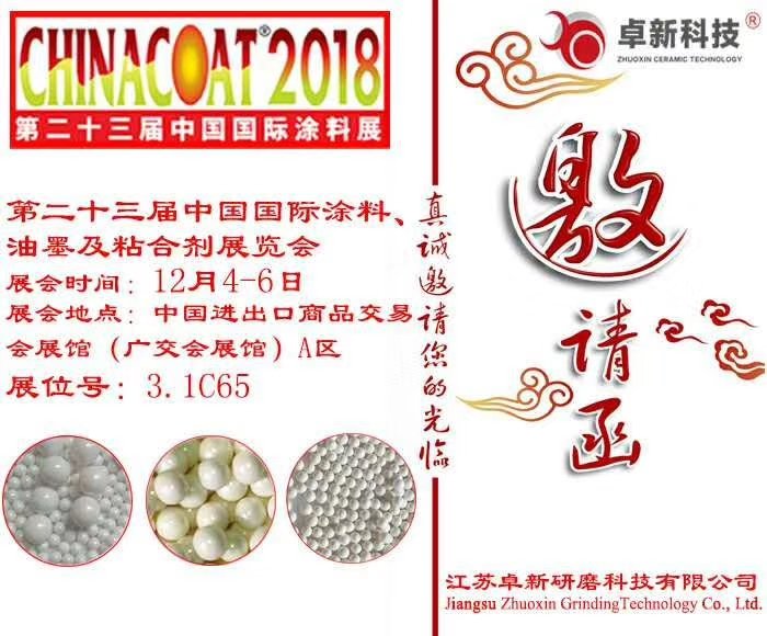 ChinaCoat 2018第二十三屆中國國際涂料展將移師廣州,定于2018年12月4--6日在廣州中國進(jìn)出口商品交易會展館盛大舉行。江蘇卓新研磨科技有限公司攜氧化鋯珠亮相盛會,期待您蒞臨展位3.1C65。