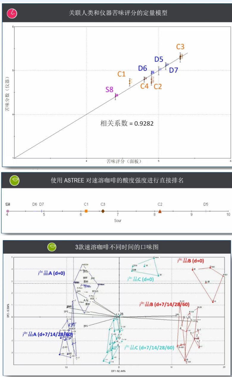 《指導原則》強調了口感設計在兒童藥物開發全生命周期(從處方前研究到上市后變更)中的重要性。它要求申請人: 重視口感屬性:明確要求評估藥物的基本味道(苦、甜、酸、咸、鮮、澀等)、嗅覺(氣味)、口腔感覺(澀感、灼燒感、沙粒感、油膩感等)以及余味。 科學評價方法:鼓勵采用客觀、靈敏、可量化的評價手段,結合必要的人體感官評價(需符合倫理),建立科學的口感評價體系。 高效篩選掩味策略:強調需要系統性地篩選和應用掩味技術(如包衣、添加矯味劑、形成復合物等),并對掩味效果進行科學驗證。 關注兒童特異性:指出兒童的味覺感知與成人存在顯著差異(如對苦味更敏感,對甜味偏好更強),評價需考慮年齡差異。 一、速溶咖啡感官分析的挑戰:人鼻的局限與需求 二、電子鼻登場:嗅覺的“科學之眼” 三、電子鼻在速溶咖啡中的核心應用與價值 清晰展示了電子鼻分析下香氣/苦味/酸度隨品牌或時間變化的顯著差異和趨勢。 四、超越感官:電子鼻帶來的變革性意義 電子鼻在速溶咖啡感官分析中的應用,其意義遠不止于提供數據: 提升品質管控精度與效率:從原料進廠、生產過程監控(如烘焙終點判斷、風味均勻性)、到最終成品檢驗、包裝評估,實現全鏈條快速、客觀的感官指標監控,確保出廠產品品質穩定如一。 驅動產品創新與優化:基于精準的風味數據,研發人員可以更有的放矢地調整配方、工藝,開發出更符合目標消費者口味的新品,或優化現有產品。 保障品牌聲譽與消費者信任:通過科學手段確保風味一致性,有效應對摻假質疑、保質期投訴,維護品牌形象。 決策支持的科學化:無論是選擇包裝材料、設定保質期、還是進行產品定位,電子鼻提供的客觀數據都是管理層做出更明智決策的有力支撐。 標準化與合規性:為感官評價建立可量化的標準,有助于滿足日益嚴格的食品安全和品質規范要求。