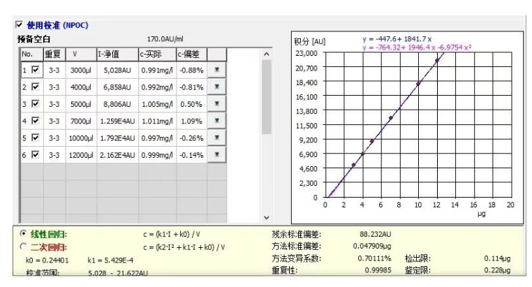 德國耶拿TOC解決方案 難點突破1:直接進樣,無需稀釋 電子級試劑往往由于其純度高但待測TOC含量低,而使得允許的稀釋倍數受限。有些高純試劑稀釋后TOC將與空白無差別,無法準確定量。 以雙氧水為例,其在分解過程中會產生大量氧氣,同時高溫下水分會迅速氣化,測定時的氣流波動會嚴重干擾測定結果。傳統分析采用稀釋進樣的方法,而電子級的雙氧水含量特別低,稀釋后TOC含量與空白相差不大,會帶來很大的稀釋誤差,同時空氣中的CO2也會影響分析結果。 德國耶拿獨家的VITA技術用來補償不可避免的分析氣體流量的波動引起的信號變化,拓寬低濃度的檢測范圍,使得TOC系統更精確,靈敏,穩定。對高達70%濃度H2O2溶液無需進行稀釋,可直接進樣分析。同時配備高聚焦NDIR檢測器,對CO2具有更高靈敏度,可獲得更為可靠的結果,且一次進樣可以同時分析TOC和TN參數,可以實現高效高通量測定。 案例一:30%/70% 雙氧水TOC/TN測定 對電子級分別為30%和70%雙氧水溶液進行直接測定,70%雙氧水RSD達到0.5%,說明VITA流量技術很好地消除了燃燒過程中氣流波動帶來的影響,測試樣品后對2.5ppm的標液進行回測,回收率為103%,說明儀器的氧化性能佳;且儀器能兼顧TN的同時測試,為品控提供有力的數據支持。 難點突破2:超強的酸堿耐受性 對于酸堿性的樣品,如果直接進入定量閥,長時間會腐蝕定量閥的密封圈和內部器械,會加劇定量閥的損壞速度,導致進樣體積不準確等問題。德國耶拿在硬件上進行技術革新,在保證進樣體積準確性的前提下,用超純水代替樣品進入定量閥,避免樣品對定量閥的損耗,可以長時間分析酸堿性,甚至是有一定顆粒的高鹽樣品,耗材少,維護成本低。 案例二:電子級硫酸中TOC測定 考慮到高純硫酸在管道有很明顯的放熱反應,樣品稀釋測定,同時進行加標回收實驗。從實驗數據可以看出,樣品加標回收率為96%,TOC標樣的回收率為97%,說明儀器對高純硫酸的基體耐受性好,能準確測定電子級硫酸中低濃度TOC的含量。 案例三:電子級氨水中TOC測定 由于氨水是堿性溶液且電子級的氨水TOC濃度本身就比較低,容易吸收空氣中的CO2 ,造成結果的不準確性,測試前對樣品進行稀釋中和,同時扣除酸空白。從實驗數據可以看出,樣品RSD均小于1%,0.1ppm的樣品加標回收率為99%,0.1ppm TOC標樣的回收率為102%,說明儀器對低TOC的電子級氨水測定準確性高。 難點突破3:儀器自動繪制標準曲線+ 長達一年校準周期 對于較低TOC濃度樣品的測定,如何繪制低濃度的標準曲線顯得非常重要。由于配制標液需要稀釋液,但實驗室很難找到TOC為零的稀釋液,在配制溶液的過程也容易引入空氣中的CO2 ,得不到線性較好的曲線。德國耶拿multi N/C 總有機碳分析儀提供吸取不同體積繪制曲線的功能,無需人為配制曲線,線性輕松達到0.999以上,且校準周期長達一年,減少每次做樣前曲線繪制的人力和時間,讓您有更多的時間做重要的事情。 綜上,德國耶拿multi N/C 總有機碳分析儀能輕松應對高純濕電子化學品超低TOC的測定需求,幫助企業實時監控生產過程中的化學品純度,確保生產效率和產品質量,提高產品的市場競爭力。