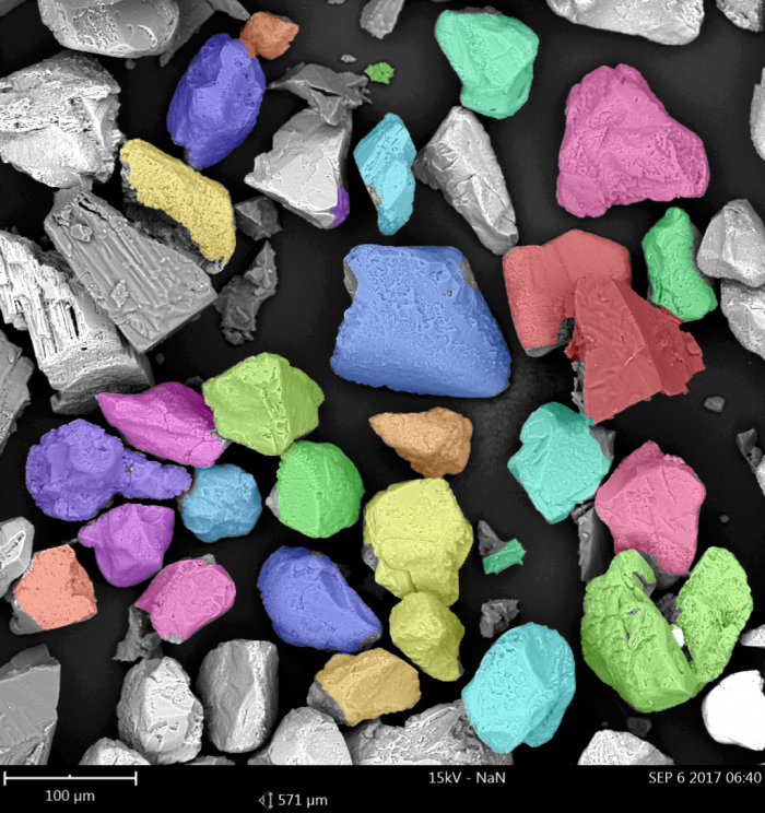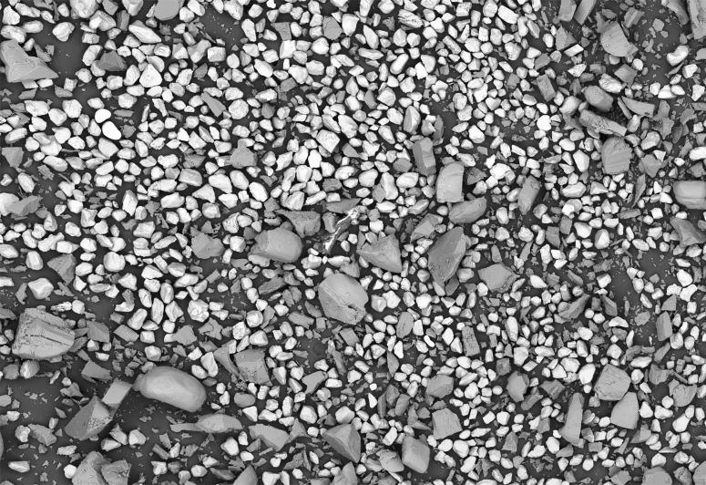 對(duì)飛納臺(tái)式掃描電鏡進(jìn)行編程,可以自動(dòng)拍攝掃描電鏡(SEM)圖像并獲得拼圖,還可以使用顆粒統(tǒng)計(jì)分析測(cè)量系統(tǒng)(Particlemetric)對(duì)識(shí)別到的顆粒進(jìn)行測(cè)量和統(tǒng)計(jì)分析。下圖拍攝視野為 5.3 x 3.6 mm,分辨率為 500 nm。