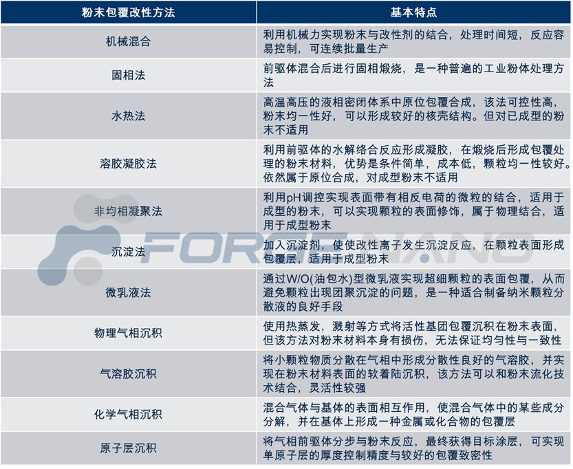 根據原理的不同,包覆改性手段大致可分為:固相法,液相法以及氣相法,和材料的制備方式類似。涂層材料可以在粉末材料合成的過程中一步合成,也可以在成型的粉末材料表面原位合成或直接耦合包覆材料。