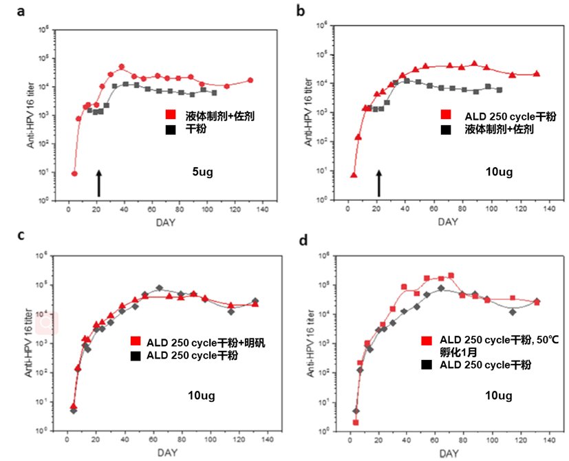 VitraVax 公司通過其獨家的 ALTATM 技術平臺,獲得了高熱穩定性的海藻糖基抗原佐劑干粉(可在 70 度下實現數月的存儲),結合 PALD 技術,在顆粒表面包覆納米級的氧化鋁涂層,不僅改善了粉末的分散性和流動性,更能維持了長達 6 個月的緩釋效果(該測試采用 HPV 16 疫苗驗證)