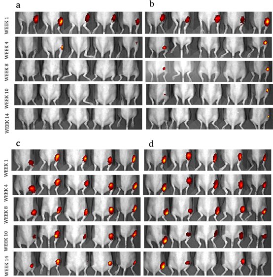 標記后的疫苗在小鼠體內釋放 L1 抗體蛋白圖像(a. 無包覆;b. 100 cycle ALD; c. 250 cycle ALD; d. 500 cycle ALD)