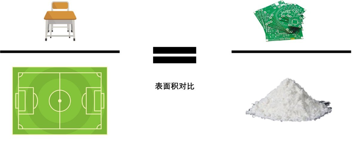 對于粉末樣品,由于比表面積的增大,消耗的前驅體量也呈幾何數量級增長。這意味著,相同質量下,粉末樣品需要更多的前驅體進行 ALD 反應。而粉末的粒徑越小,其比表面積越大。相同質量的平面器件其表面積與 1mm 直徑粉末相差 10 倍以上,而與 10μm 粉末比表面差異更接近 16000 倍,相當于一張課桌與標準足球場面積的差別。
