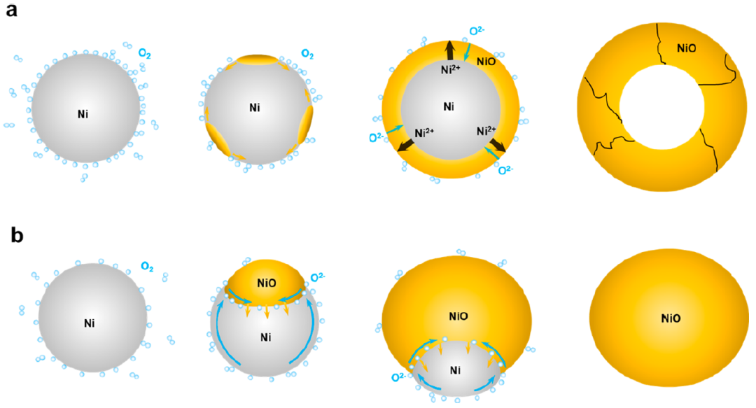 摘要:了解各種金屬納米顆粒在常壓下的氧化機(jī)制,對(duì)于發(fā)揮它們?cè)谥T多領(lǐng)域中的最大價(jià)值是非常重要的。借助常壓 TEM 技術(shù),該團(tuán)隊(duì)研究了大氣壓下不同溫度時(shí)鎳納米顆粒的動(dòng)態(tài)氧化過程,揭示了一種溫度依賴的氧化行為。溫度較低(600℃)時(shí),鎳納米顆粒的氧化遵循柯肯達(dá)爾效應(yīng),伴隨著氧化物殼層的生成;溫度較高(800℃)時(shí),氧化開始于金屬表面的一個(gè)單晶成核,然會(huì)沿著金屬-氧化物界面逐步推進(jìn),直至全部氧化,期間并沒有空洞生成。通過實(shí)驗(yàn)和 DFT 計(jì)算,團(tuán)隊(duì)提出了基于鎳納米顆粒的溫度依賴的氧化機(jī)制,該機(jī)制歸因于不同溫度下氣體吸附和擴(kuò)散速率的差異。