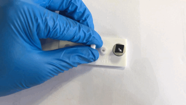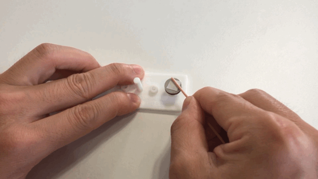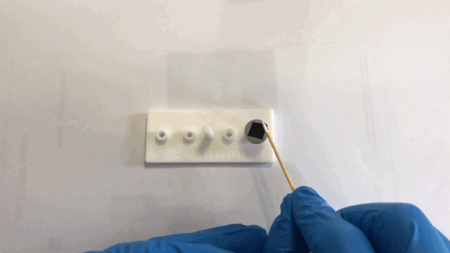第二步 戴上手套,用牙簽挑取少量粉末,轉(zhuǎn)動牙簽,把粉末倒在導(dǎo)電膠上