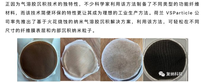 正因?yàn)闅馊苣z沉積技術(shù)的獨(dú)特性,不少科學(xué)家利用該方法制備了不同類型的功能纖維材料,而該技術(shù)簡(jiǎn)便環(huán)保的特性更讓其成為理想的工業(yè)生產(chǎn)方法。荷蘭 VSParticle 公司率先推出了基于火花燒蝕的納米氣溶膠沉積解決方案,利用該方法,可輕松在不同尺寸的纖維膜表層和內(nèi)部沉積納米粒子。