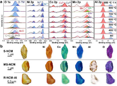 圖 3. a. MS-NCM 樣品燒結時,氧1s、鎳2p、錳2p、鋁2p的原位同步輻射 XPS 譜;b. NCM523 顆粒的 3D 透射電鏡重構圖,以及對應的鎳、鈷、錳、鋁、氧元素的能譜重構圖。