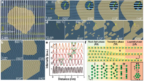 圖 4.a. RS 結構表面 TP 結構初始生長的 HRTEM IFFT 圖像;b. 時間分辨率 HRTEM IFFT 圖像揭示了 800 ℃ 燒結時 TP 結構的震蕩生長;c. 時間分辨率 HRTEM IFFT 圖像揭示了 800 ℃ 燒結時 TP 結構的擴張生長;d. 時間分辨率 HRTEM IFFT 圖像揭示了燒結時 TP 區域的合并;e. 圖 4d 中黃線位置的圖像強度曲線;f. 所觀察到相變過程的示意圖展示。