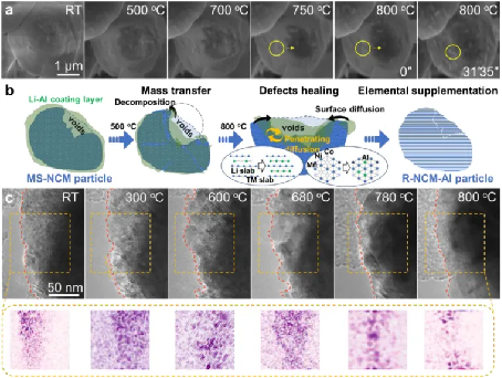 圖 5. a. 原位 HRTEM 圖像記錄了從室溫到 600 ℃ 時鋁包覆層遷移到 NCM523 顆粒裂縫的過程;b. 原位 HRTEM 圖像反映了 800 ℃ 時 NCM523 晶粒中補充鋁的擴散過程;c. 原位 HRTEM 圖像展示了 NCM523 顆粒的表面空位的熱愈合過程。