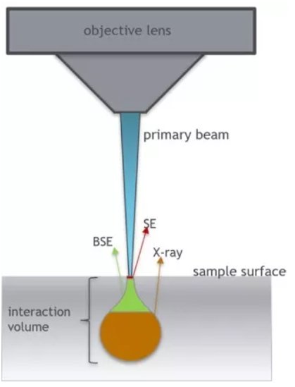 電子束與樣品相互作用將會激發出多種電子信號,包括背散射電子(BSE)、二次電子(SE)等。二次電子(SE)主要表征樣品的表面形貌信息,激發深度一般低于 10nm,主要表征樣品的表面形貌信息。