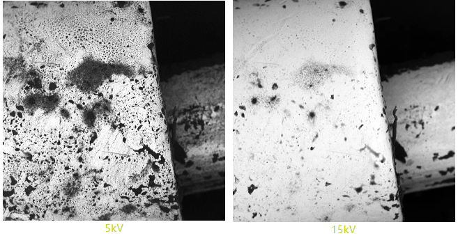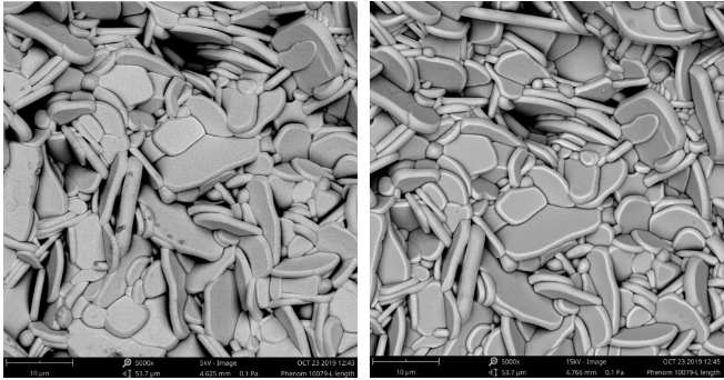 陶瓷在不同加速電壓(5kV、15kV)下的兩張照片: 加速電壓為 5kV 時,可以看到燒結陶瓷的缺陷。