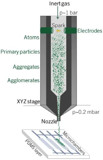 在氣流中產生納米氣溶膠后,這些顆粒經低真空環境下的噴嘴加速并通過撞擊沉積的方式沉積在多種類型的基材上。沉積的驅動力是沉積室和 VSP-G1 系統(噴嘴上游)之間的壓力差。通過 XYZ 載物臺控制、顯微鏡攝像頭模塊和直觀的用戶界面可以打印沉積特定的路徑,從而可以控制實驗參數,進行完全由納米粒子組成的圖案繪制。