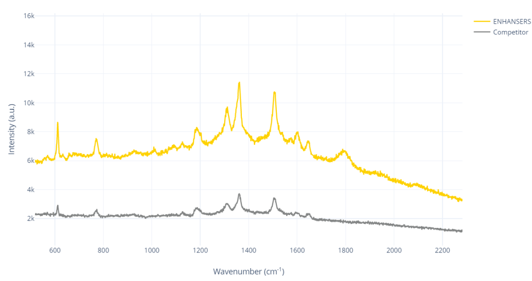 表面增強拉曼光譜 (SERS) 是一種高度靈敏的檢測技術,可以極大地促進化學和生物傳感技術在多領域的應用。利用 VSP-P1 納米印刷沉積系統進行無配體印刷納米粒子印刷,制備納米多孔結構傳感器已被證明對于開發用于不同物質分析的 SERS 基板非常有效。此外,由于樣品制備簡單且自動化程度高,基板的優化可在數月內實現。由于該技術的可重現性較好,使用不同的基板時,也不需要改變納米粒子的合成和沉積過程即可實現批量合成工藝。