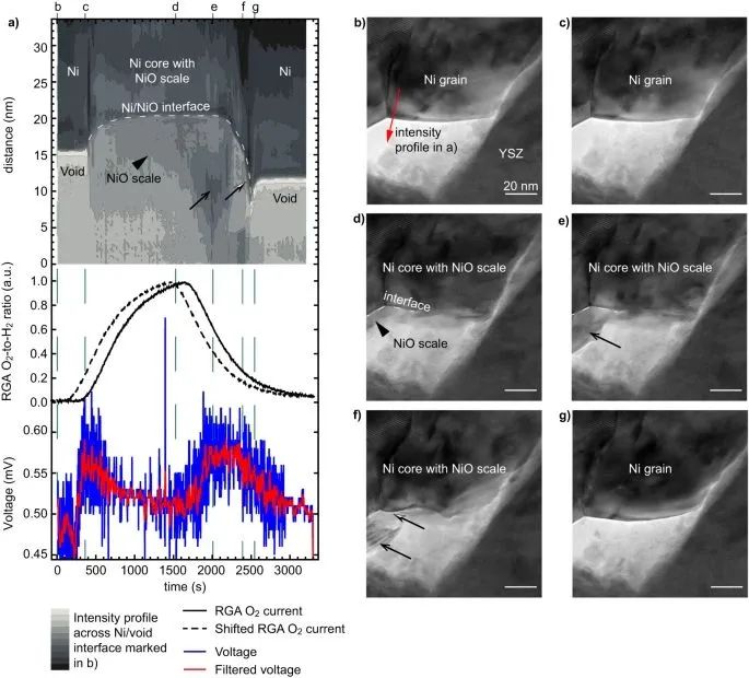 圖3:a) 沿 圖b)所示紅色箭頭方向拍攝的 TEM 圖像強度變化、RGA測得的氧氣/氫氣比例(原始數據,實線;前移 180 秒,虛線)以及正極、負極間測量的開路電壓(原始數據和高斯濾波數據)的等值線圖。b-g) 在再氧化和還原過程的關鍵步驟中鎳晶粒邊緣的 TEM 圖像選集。黑色箭頭和三角形所指的是鎳晶粒表面發生的關鍵形態變化。