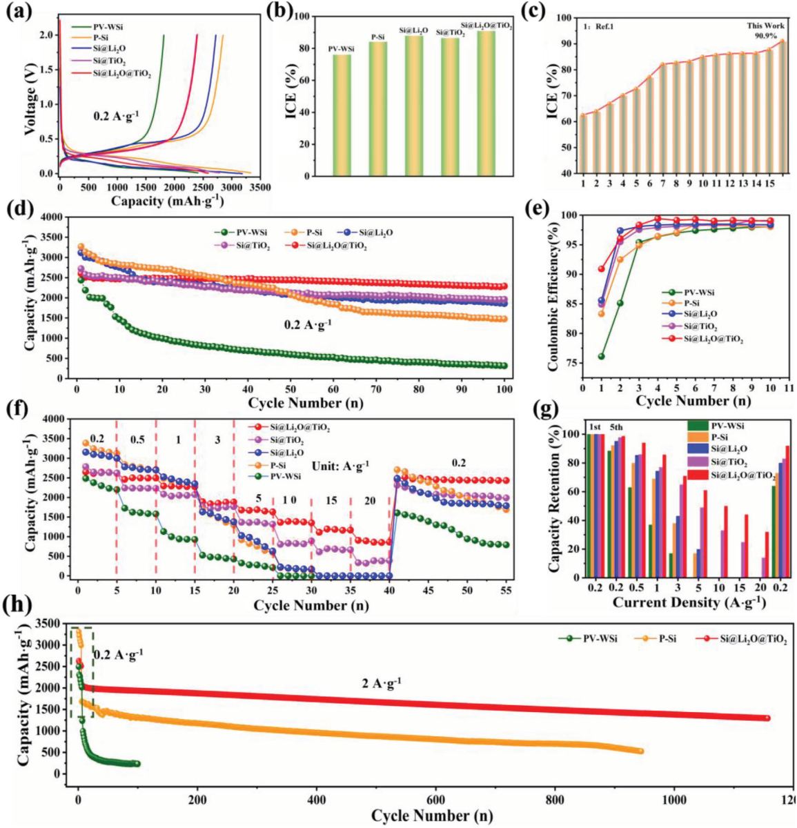 a) PV-WSi、P-Si、Si@Li2O、Si@TiO2 和 Si@Li2O@TiO2 的電壓-容量曲線以及 b) 它們的初始庫侖效率(ICE);c) 本研究中 Si@Li2O@TiO2 電極的 ICE 與之前報道的基于硅的負(fù)極材料的 ICE 進(jìn)行比較;d) PV-WSi、P-Si、Si@Li2O、Si@TiO2 和 Si@Li2O@TiO2 的循環(huán)性能以及 e) 前十個循環(huán)的庫侖效率,f) 不同電流下的倍率性能,以及 g) PV-WSi、P-Si、Si@Li2O、Si@TiO2 和 Si@Li2O@TiO2 的容量保持率;h) PV-WSi、P-Si 和 Si@Li2O@TiO2 的長期循環(huán)性能。