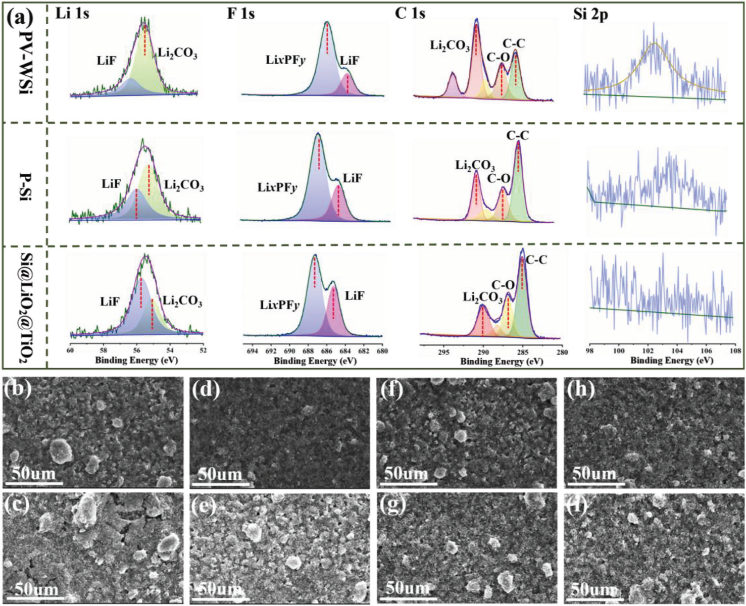 a) PV-WSi、P-Si、Si@Li2O@TiO2 電極在 2 A g-1 下循環(huán) 100 次后的 Li 1s、F 1s、C 1s、Si 2p XPS 光譜;b) PV-WSi、d) P-Si、f) Si@TiO2 h) Si@Li2O@TiO2 電極在循環(huán)前的 SEM 圖像;c) PV-WSi、e) P-Si、g) Si@TiO2 i) Si@Li2O@TiO2 電極在 2 A g-1 下循環(huán) 100 次后的 SEM 圖像。