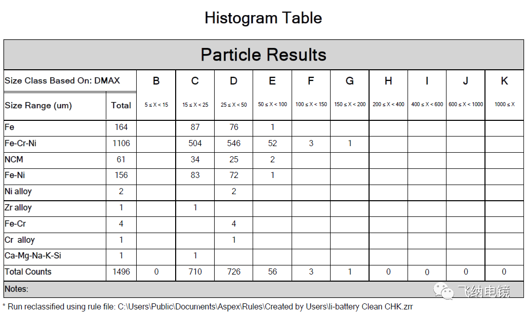 雜質(zhì)的分析結(jié)果嚴(yán)格按照 VDA19 要求的格式呈現(xiàn),顆粒分類(lèi)統(tǒng)計(jì)結(jié)果更有助于評(píng)估鋰電池生產(chǎn)的清潔度情況,方便不同批次樣品的對(duì)比,以及生產(chǎn)工藝調(diào)整的驗(yàn)證。