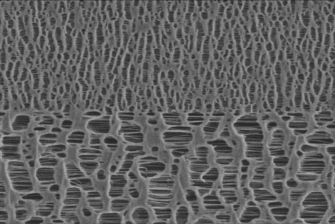 圖2電池隔膜橫截面掃描電子顯微鏡圖像。具有兩種不同微觀結構的聚烯烴相,可以清晰地觀察到明顯差異(來源:Technoorg Linda)