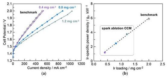VSparticle 的客戶使用 VSP-G1 納米粒子發(fā)生器實現(xiàn)了催化劑效率的突破,該發(fā)生器使用火花燒蝕技術(shù)生產(chǎn)銥納米粒子[3]。這些納米粒子只有 2nm 大小,被涂在膜上,顯示出顯著減少銥使用量的能力(圖 1)。具體來說,與傳統(tǒng)的商用銥基催化劑相比,它們將銥負(fù)載減少了四倍,同時保持了同等的性能水平。