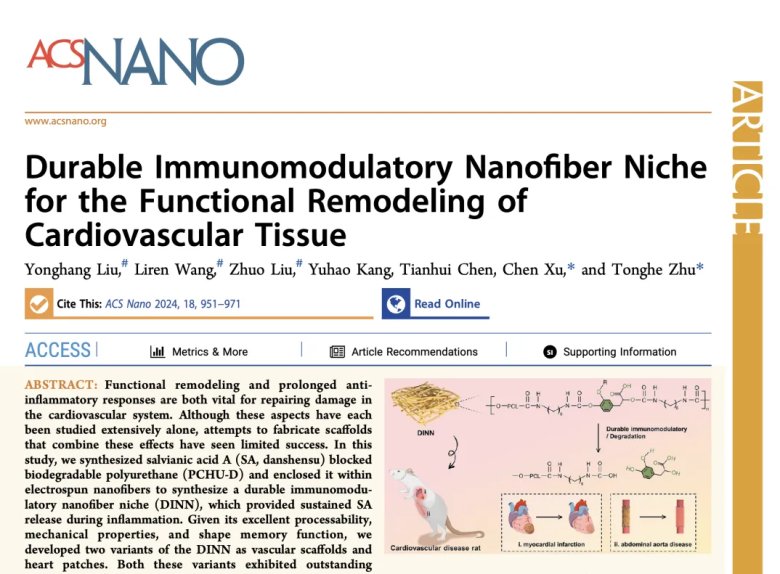 2024 年,上海工程技術(shù)大學(xué)朱同賀教授團(tuán)隊與復(fù)旦大學(xué)徐晨博士團(tuán)隊合作,在期刊《ACS Nano》上發(fā)表題為“ Durable Immunomodulatory Nanofiber Niche for the Functional Remodeling of Cardiovascular Tissue”的論文。論文中制備了一種具有長期免疫調(diào)節(jié)功能的納米纖維生態(tài)位(DINN),可以用于心血管組織修復(fù)和功能重塑。