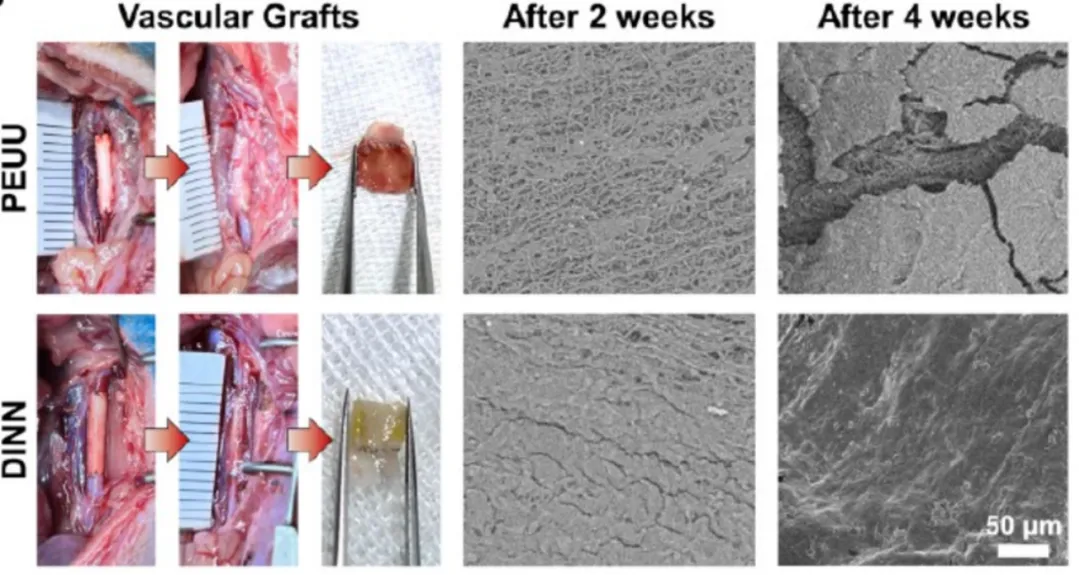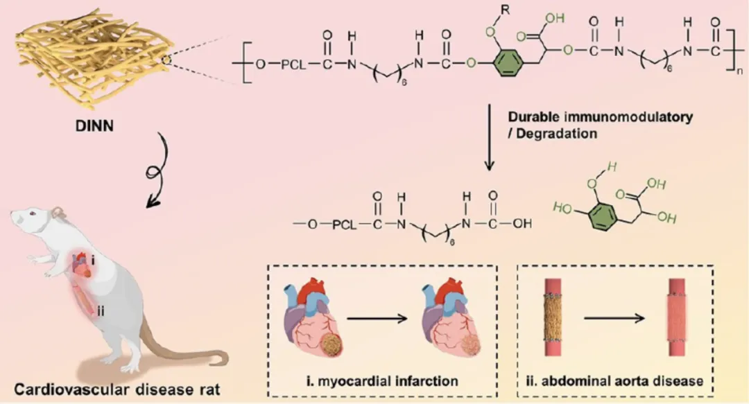 為了解決上述挑戰(zhàn),兩個團(tuán)隊合成了可降解聚氨酯彈性體,以 SA 作為擴(kuò)鏈劑。然后將這些彈性體靜電紡絲成納米纖維支架,以產(chǎn)生耐用的免疫調(diào)節(jié)納米纖維微環(huán)境 (DINN)。SA 響應(yīng)周圍的再生微環(huán)境從納米纖維中釋放出來,直到材料完全降解。DINN 在降解過程中表現(xiàn)出穩(wěn)定的機(jī)械性能,證明其適合長期體內(nèi)植入以治療心血管系統(tǒng)損傷。體外實驗驗證了 DINN 的各種作用,例如其持續(xù)的抗炎作用和抑制細(xì)胞凋亡。更重要的是,DINN 可以響應(yīng)炎癥浸潤而降解,從而釋放相應(yīng)的 SA。DINN 的生物治療作用在心肌梗死 (MI) 大鼠模型和腹主動脈移植中得到進(jìn)一步證實。研究結(jié)果表明 DINN 可以用于治療心血管組織損傷。