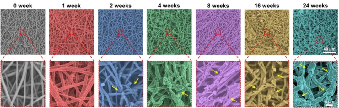 該文章使用 Phenom XL 臺式掃描電鏡大倉室卓越版,用于觀察:(1)靜電紡絲后的DINN 形貌;(2)不同時間段 DINN 降解后形貌;(3)血液相容性評估中,測試 DINN 纖維表面血小板;(4)DINN植入生物體后一段時間,修復(fù)組織在其表面生長情況。
