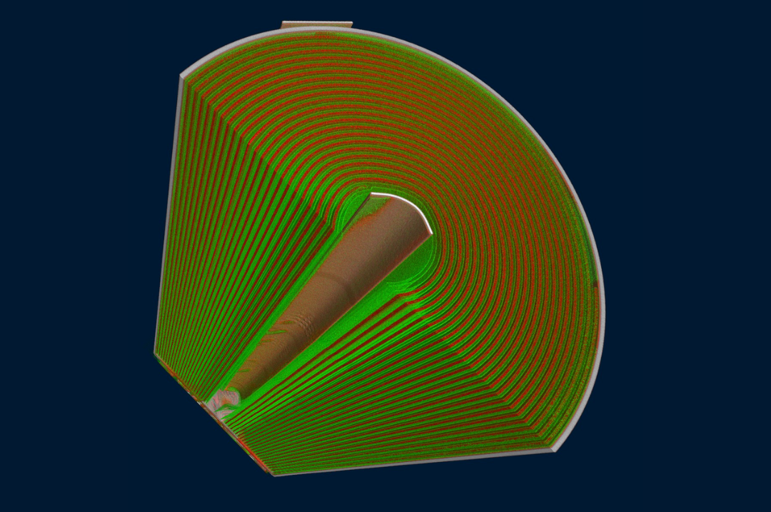 圖2 使用 Neoscan N70 通用型顯微CT 掃描 18650 型電池(長度70毫米),內部結構得以清晰展示。