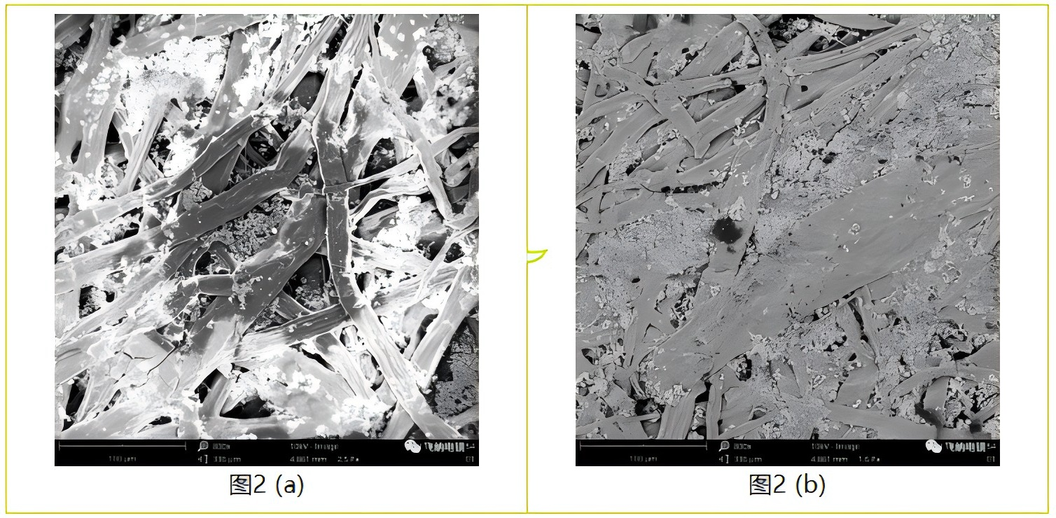 在樣品表面鍍上一層導(dǎo)電膜不僅能夠改善樣品的導(dǎo)電性,而且能夠提高樣品信號(hào)量。圖 2 是紙張的掃描電鏡照片,圖 2 (a) 是沒有鍍膜的樣品照片,圖 2 (b) 是鍍膜后的樣品照片。從圖中可以明顯看出兩者的差別。鍍膜也有其缺點(diǎn),鍍膜會(huì)在樣品表面覆蓋一層薄膜,掩蓋樣品表面真實(shí)形貌。
