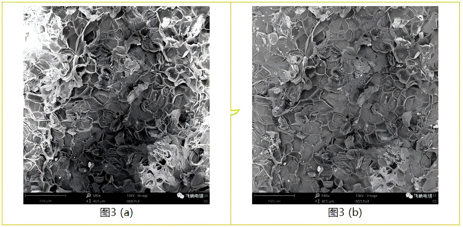 圖 3 是使用飛納臺(tái)式掃描電鏡(Phenom XL)拍攝的梧桐樹皮照片,圖 3 (a) 是在高真空模式(HIGH)下拍攝的圖片,樹皮表面放電現(xiàn)象明顯,局部區(qū)域發(fā)亮;采用低真空模式(LOW)拍攝,可以發(fā)現(xiàn)樣品表面放電現(xiàn)象消失。
