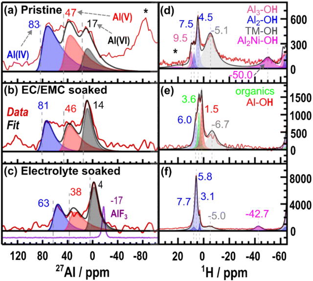 圖2. ALD NMC811的2?Al魔角旋轉(MAS)核磁共振(NMR)譜圖:(a)合成后的原始狀態,(b)在EC/EMC(3:7,體積比)溶劑中浸泡24小時后(隨后在真空中干燥),以及(c)在1 M LiPF?的EC/EMC(3:7,體積比)電解液中浸泡24小時后(隨后在真空中干燥)。ALD NMC811的1H MAS NMR譜圖:(d)原始狀態,(e)在EC/EMC溶劑中浸泡24小時后,以及(f)在1 M LiPF?的EC/EMC電解液中浸泡24小時后。