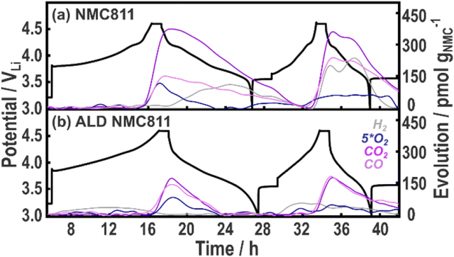 圖6. 在線電化學質譜(OEMS)及對應的NMC811|Li電壓曲線:(a)未涂覆Al?O?的NMC811|Li,(b)涂覆Al?O?的NMC811|Li。原位電池在3–4.6 VLi之間循環,充電速率為C/10,隨后為C/5(假設實際容量為200 mAh g?1),在充電上限保持1小時,使用氬氣作為載氣。