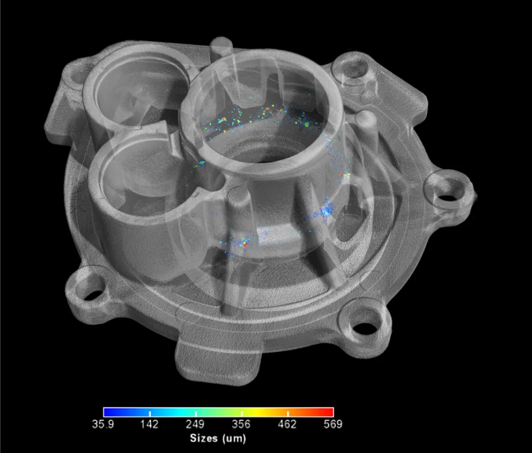 使用 Neoscan NXL 臺式大倉顯微 CT 以 35.9 微米像素大小掃描汽車鑄造鋁合金水泵殼體,半透明體積渲染,內部空洞尺寸進行顏色編碼。直觀顯示缺陷分布,適合工業質量控制與逆向分析。