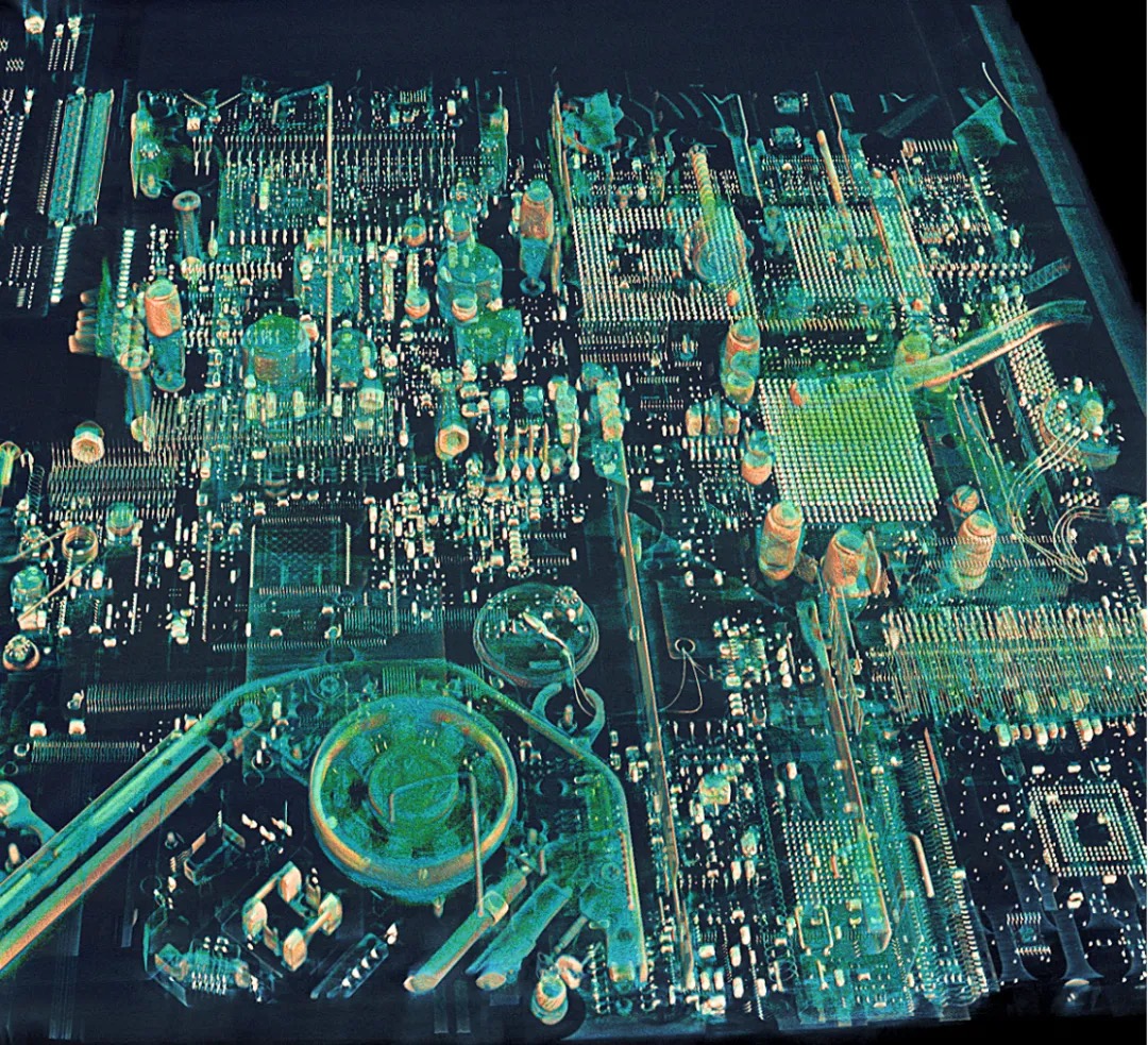 使用 Neoscan NXL 臺式大倉顯微 CT 以 35 微米像素大小掃描15寸筆記本電腦,半透明渲染,呈現復雜電路、結構布局,主板細節清晰可見。