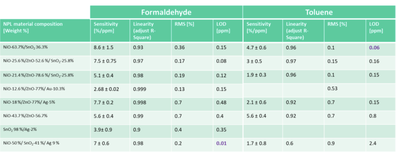 在本案例中,基于金屬氧化物半導(dǎo)體(MOS)及金屬催化劑的納米多孔層(NPLs)通過印刷方式沉積在多傳感器陣列平臺上,并以甲苯和甲醛作為目標(biāo)氣體進行測試。最多三種不同組分的 NPLs 被用作傳感層。研究從靈敏度、選擇性、響應(yīng)/恢復(fù)時間及檢出限(LOD)等關(guān)鍵性能指標(biāo)出發(fā),系統(tǒng)分析了材料組成對氣體傳感性能的影響。