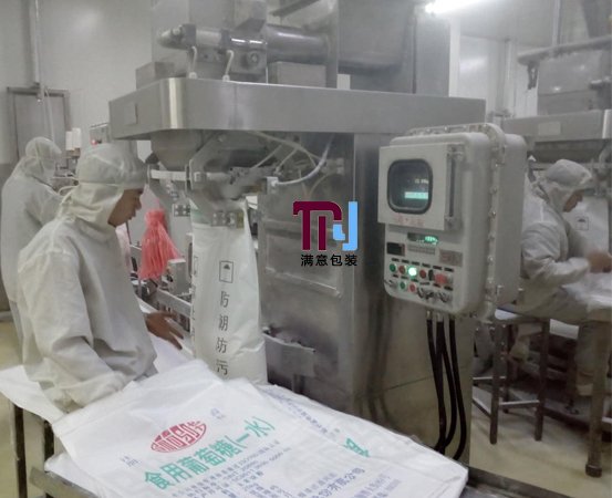 當定量包裝秤進入自動運行狀態后,稱重控制系統打開給料門開始加料,該給料裝置為快、慢兩級給料方式;當物料重量達到快給料設定值時,停止快給料,保持慢給料;當物料重量達到最終設定值時,關閉給料門,完成動態稱重過程;此時系統檢測夾袋裝置是否處于預定狀態,當包裝袋已夾緊后,系統發出控制信號打開稱量斗卸料門,物料進入包裝袋中,物料放完后自動關閉稱量斗的卸料門;卸空物料后松開夾袋裝置,包裝袋自動落下;包裝袋落下后進行縫包并輸送到下一工位。如此循環往復自動運行。