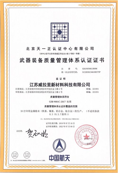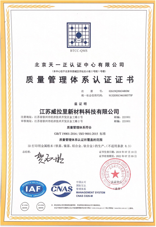 江蘇威拉里新材料科技有限公司是由徐州礦務集團投資組建的國家級高新技術企業。公司引進中南大學、西北工業大學、哈爾濱工業大學真空氣霧化、電極感應氣霧化等制粉技術。主要從事鐵合金、高溫合金、鋁合金、鈦合金、銅合金、鈷鉻合金等多種高端金屬粉體的研發、生產和銷售,并針對客戶需求,提供高質量金屬粉體個性化定制服務。產品球形度、氧含量、流動性、粒度分布等性能均達到國際先進水平,已廣泛應用于3D打印、航天航空、生物醫療、激光熔覆等高端制造領域,威拉里以優越的產品品質及專業的技術服務,致力于打造國內頂尖的高端金屬粉體制造企業。
