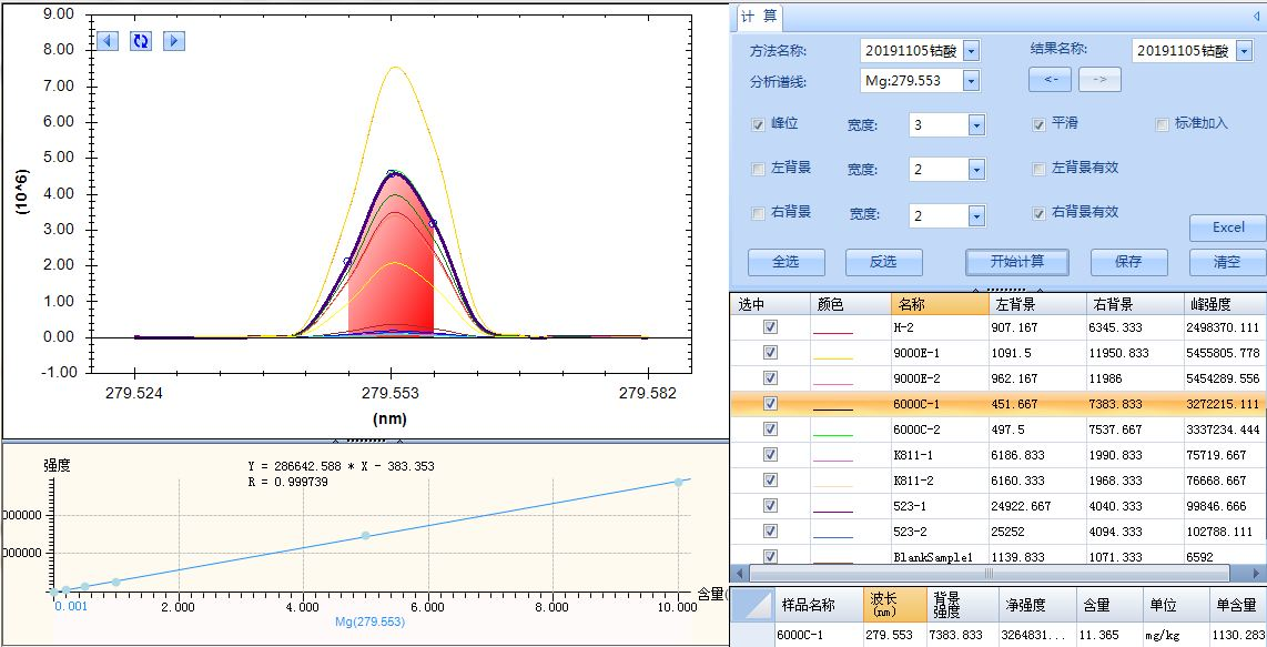 Mg-279.553 | 10.0以內 | Y=286764.250X+6649.706 | R=0.999665 | 0.0002 |