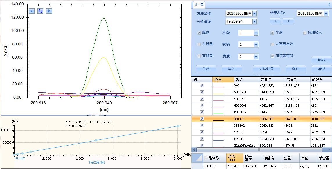 Fe-259.94 | 10.0以內 | Y=8169.577X+118.019 | R=0.999935 | 0.0028 |