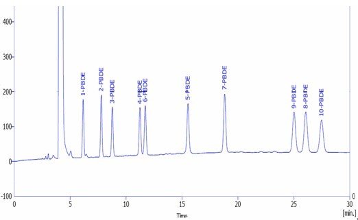 10種多溴聯(lián)苯醚標(biāo)準(zhǔn)混合溶液譜圖: