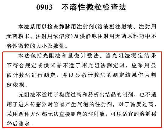 第一:當(dāng)光阻法測定結(jié)果不符合規(guī)定或供試品 不適于用光阻法測定時,應(yīng)采用顯微計(jì)數(shù)法進(jìn)行測 定,并以顯微計(jì)數(shù)法的測定結(jié)果作為判定依據(jù) 。