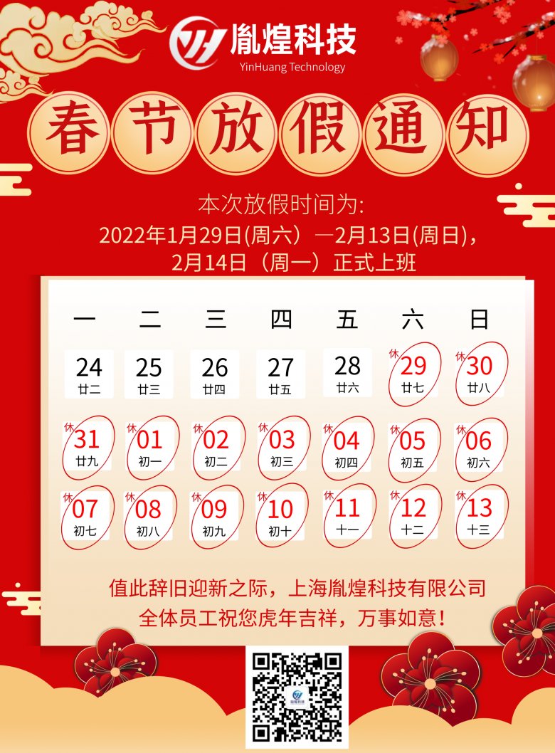 放假日期為2022年1月29日(星期六)至2022年2月13日(星期日),2022年2月14日(星期一)正式上班。