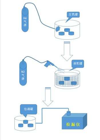 一般壓氦法檢漏時采用排除法。在夾具中放一定數量的器件,這一批的總漏率沒超過報廢預定值,說明這一批合格;總漏率超過報廢預定值可以取出一半,剩下的一半繼續檢漏,這一半合格說明有漏的器件在取出的那一半中,依此檢漏直至檢出有漏孔的器件。