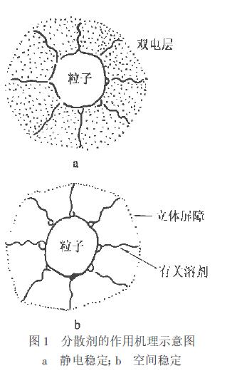 分散劑及其分類 分散劑是指能使固體顆粒表面迅速潤(rùn)濕, 又能使固體質(zhì)點(diǎn)間的能壘上升到足圖1分散劑的作用機(jī)理示意圖a 靜電穩(wěn)定;b 空間穩(wěn)定夠高的一種表面活性劑[ 2] .它廣泛應(yīng)用于染料、顏料、水泥、造紙、陶瓷等行業(yè).