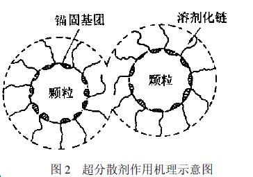 分散劑在分子結(jié)構(gòu)上有一很大的特點(diǎn), 即“兩親性” , 親水親油性.傳統(tǒng)分散劑的親油基團(tuán)一般為烴鏈結(jié)構(gòu), 并且主要是烷烴鏈.而超分散劑的分子結(jié)構(gòu)則包括錨固基團(tuán)和溶劑化鏈兩部分 .