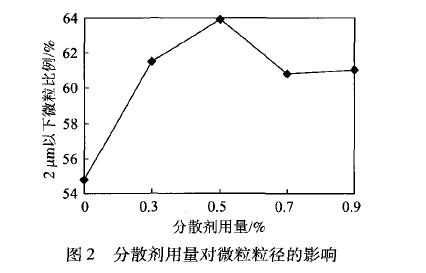 由圖2可知,隨分散劑用量的增加,2 m以下微粒所占的比例先是迅速增加,而后開始降低;在分散劑用量為0.5% 時(shí),其達(dá)到最大值(63.9%)。這是因?yàn)殡S六偏磷酸鈉用量的增加,微粒表面的電荷密度升高,粒子之問的斥力相應(yīng)增大,使得體系的分散