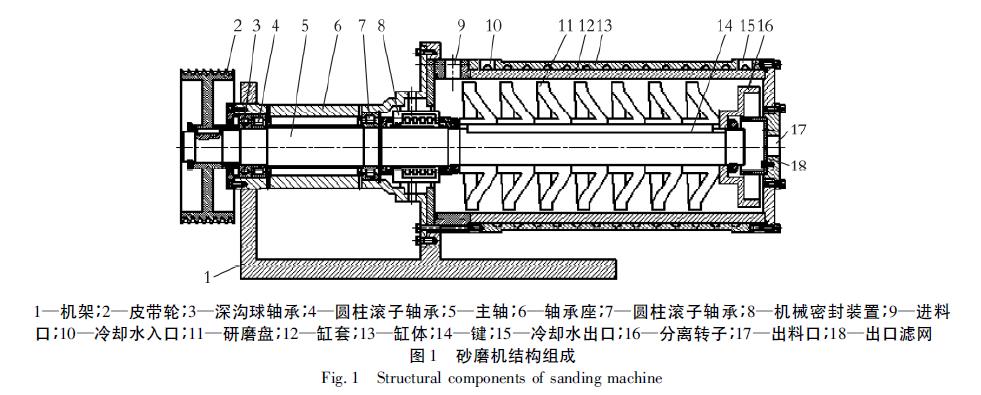 在機(jī)架1 上,缸體和缸套之間的螺旋槽兩端分別與冷卻水入口10 和冷卻水出口15 連通,形成缸體冷卻水通道。主軸5 左端通過(guò)平鍵與皮帶輪2 連接,由圓螺母軸向定位,主軸5 右端通過(guò)平鍵與7 個(gè)研磨盤11連接,通過(guò)分離轉(zhuǎn)子16,由圓螺母軸向定位,其中的7個(gè)研磨盤自左至右是改進(jìn)前端面垂直軸線的研磨盤、改進(jìn)后端面帶傾角的研磨盤交替安裝。出口濾網(wǎng)18靠螺釘固定在右缸蓋上,機(jī)械密封裝置8 把缸套12的工作腔與軸承座6 的潤(rùn)滑腔隔開(kāi)。