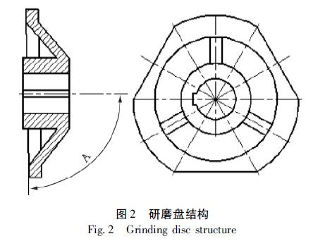 由圖2 可見(jiàn),研磨盤左端面與軸線方向成確定的夾角A,研磨盤旋轉(zhuǎn)時(shí),產(chǎn)生軸向力使固-液相混合物料軸向移動(dòng),碰到左端面與軸線方向垂直的相鄰研磨盤阻擋時(shí)反彈,在兩研磨盤間震蕩,加強(qiáng)砂磨效果。
