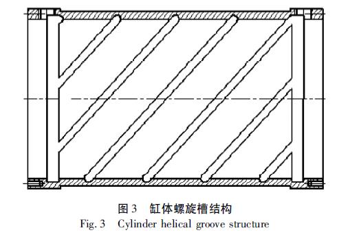 接,兩端用密封圈密封,冷卻水從缸體13 左端冷卻水入口10 流入,經(jīng)過(guò)前述截面為半圓形的螺旋槽從右端冷卻水出口15 排除,避免冷卻水循環(huán)短路,冷卻效果好。